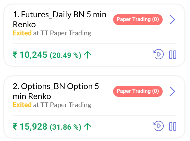 - BN ATM Options 5 min Renko – Total Trades (29) – Profit/Loss (+15928)